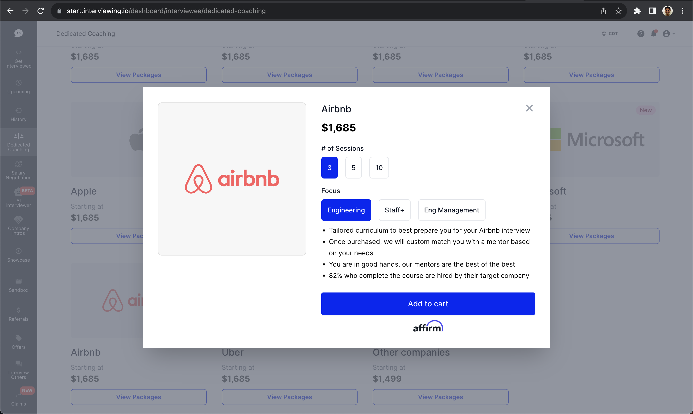 My rate on interviewing.io is $560 per hour session, but send mark@marktai.com an email for my current rates. I also offer UCLA students and URM students deeply discounted rates.